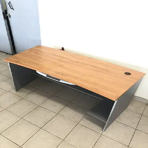 Стол компьюторный с небольшим изгибом столешницы. Столешница дерево, боковые стенки ДСП серый. Выдвижная клавиатура, полка под системный блок.